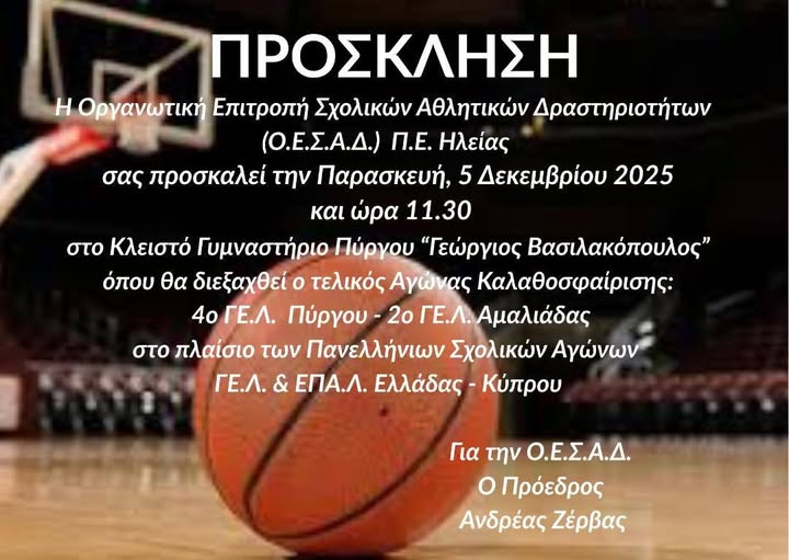 ΑΘΛΗΤΙΚΑ, ΔΗΜΟΣ ΗΛΙΔΑΣ, ΔΗΜΟΣ ΠΥΡΓΟΥ4ο ΓΕ.Λ. Πύργου και 2ο ΓΕΛ. Αμαλιαδας αναμετρώνται αυτή την Παρασκευή στον τελικό αγώνα καλαθοσφαίρισης3 Δεκεμβρίου, 2025 Προηγούμενο Άρθρο 3 Δεκεμβρίου: Μήνυμα Δήμαρχου Ήλιδας Χρήστου Χριστοδουλόπουλου για την παγκόσμια ημέρα ατόμων με αναπηρία Επόμενο Άρθρο Ανδραβίδα - Κυλλήνη: Πραγματοποιήθηκε, χθες Τρίτη 2 Δεκεμβρίου, η τακτική σύγκληση του ΤEΣOΠΠ