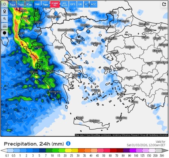 Για το υπόλοιπο της ημέρας οι όμβροι και οι τοπικές καταιγίδες θα επηρεάσουν και το υπόλοιπο Ιόνιο, όπως και την δυτική Πελοπόννησο, ενώ τα φαινόμενα στην Ήπειρο πρόσκαιρα θα εξασθενήσουν. Τοπικές ασθενείς βροχές θα σημειωθούν στην δυτική Μακεδονία (χιόνια αρχικά πάνω από τα 600-700 μέτρα, αργότερα θα ανεβούν) την δυτική Θεσσαλία, και τα δυτικότερα τμήματα της κεντρική Στερεάς. Στις υπόλοιπες περιοχές αναμένονται νεφώσεις παροδικά αυξημένες.