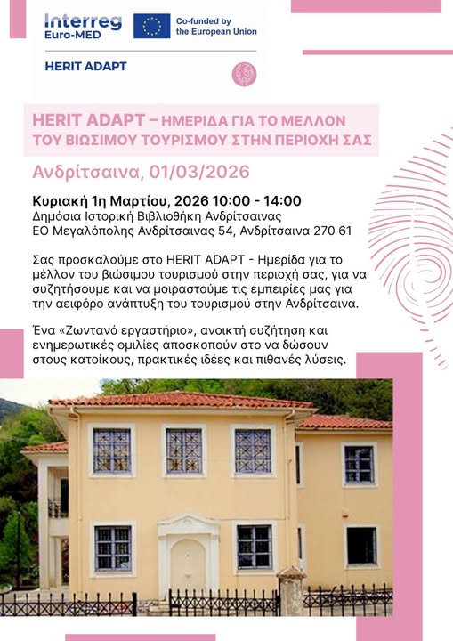 ΔΗΜΟΣ ΑΝΔΡΙΤΣΑΙΝΑΣ ΚΡΕΣΤΕΝΩΝ, ΤΟΥΡΙΣΜΟΣΆνδριταινα – Κρέστενα: Hμερίδα του προγράμματος HERIT ADAP28 Ιανουαρίου, 2026 ΑΝΟΙΧΤΗ ΠΡΌΣΚΛΗΣΗ στην μερίδα του προγράμματος HERIT ADAP. Μια ανοιχτή συνάντηση όπου μπορούμε να συμμετέχουμε, να ακουστούμε και να καταθέσουμε τα ζητήματα και τις ιδέες μας προς όλους τους τοπικούς φορείς. Μας αφορά όλους! Προηγούμενο Άρθρο Σύσκεψη Λιβάνιου με Περιφερειάρχες για τον νέο Κώδικα Αυτοδιοίκησης Επόμενο Άρθρο Ήλιδα: Εγκρίθηκαν 210.000€ για την εγκατάσταση τριών νέων συστημάτων SEATRAC σε Σαβάλια, Παλούκι και Μαραθιά