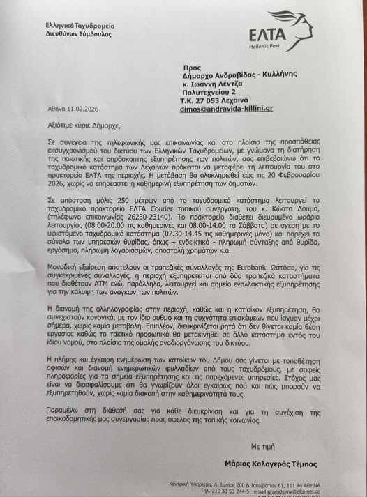 Ο Δήμος Ανδραβίδας-Κυλλήνης εγγυάται ότι η μετάβαση θα ολοκληρωθει χωρίς την παραμικρή διακοπή στην παροχή υπηρεσιών από τα ΕΛΤΑ προς τους δημότες μας, παραμένοντας σε διαρκή εγρήγορση.