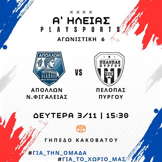 ΑΘΛΗΤΙΚΑ, ΔΗΜΟΣ ΖΑΧΑΡΩΣ, ΔΗΜΟΣ ΠΥΡΓΟΥΑπόλλων Ν. Φιγαλείας vs Πέλοπας Πύργου αύριο, Δευτέρα 3 Νοεμβρίου!2 Νοεμβρίου, 2025 Προηγούμενο Άρθρο Δικαίωση και Παράταση για τα Καταστήματα των ΕΛΤΑ της Περιφέρειας – Αναστολή Αλλαγών! Επόμενο Άρθρο Η Φιγαλική Γή φιλοξένησε το Διεθνές Ιστορικό Ράλυ Πελοποννήσου και κέρδισε τα εύσημα (ΦΩΤΟ)