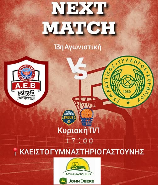 ΑΘΛΗΤΙΚΑ, ΔΗΜΟΣ ΠΗΝΕΙΟΥΑθλητική Ένωση Βαρθολομιού vs Γυμναστικός Σύλλογος Κορωπίου7 Ιανουαρίου, 2026 Σημαντικό εντός έδρας παιχνίδι αυτή την Κυριακή 11/1 Γ.Σ. Κορωπίου Κλειστό Γυμναστήριο Γαστούνης 17:00 Ραντεβού όλοι στο γήπεδο να στηρίξουμε την ομάδα μας. Προηγούμενο Άρθρο Λαμπρός ο εορτασμός των Θεοφανίων στον Δήμο Πηνειού (ΦΩΤΟ) Επόμενο Άρθρο Έκτακτη συνεδρίαση του ΤΕΣΟΠΠ Δήμου Ήλιδας