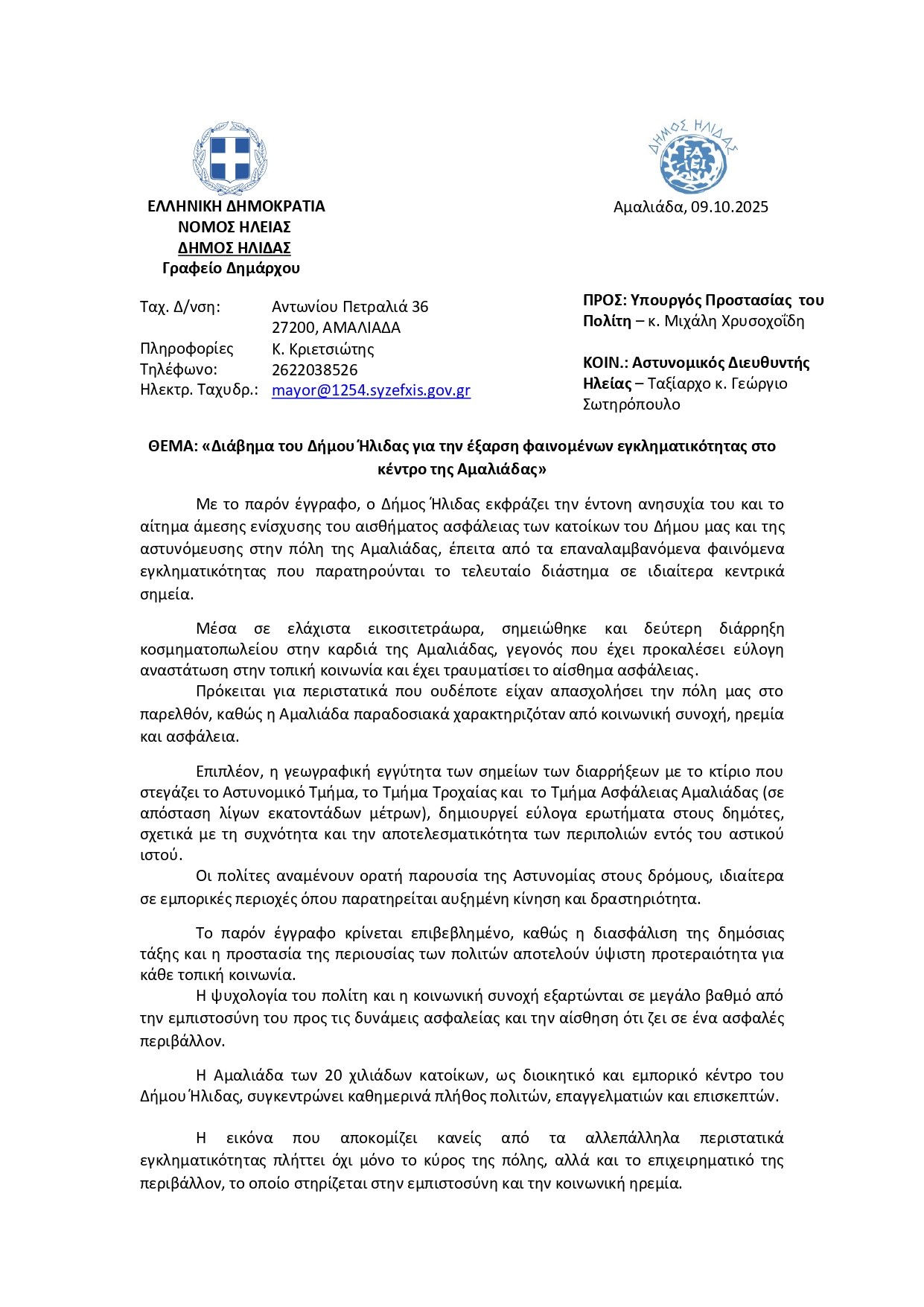 Μετά τα απανωτά κρούσματα εγκληματικότητας στο κέντρο της Αμαλιάδας, ο Δήμος Ήλιδας, με πρωτοβουλία του Δημάρχου κ. Χρήστου Χριστοδουλόπουλου, προχώρησε σε επίσημο διάβημα προς τον Υπουργό Προστασίας του Πολίτη κ. Μιχάλη Χρυσοχοΐδη και τον Αστυνομικό Διευθυντή Ηλείας, Ταξίαρχο κ. Γεώργιο Σωτηρόπουλο.
