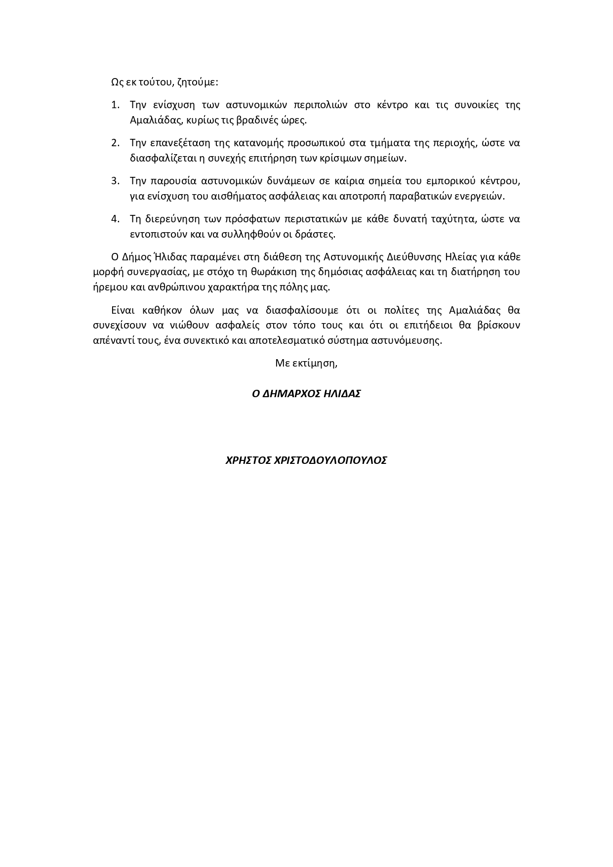 Όπως αναφέρει ο Δήμαρχος Ήλιδας κ. Χρήστος Χριστοδουλόπουλος: «Η Αμαλιάδα ήταν πάντοτε μια πόλη ήρεμη, φιλόξενη και ασφαλής. Τα πρόσφατα περιστατικά εγκληματικότητας, όμως, έχουν προκαλέσει σοβαρή ανησυχία στους κατοίκους και δεν μπορούν να μείνουν αναπάντητα.
