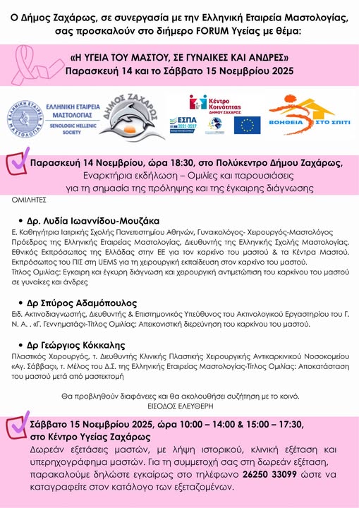 Ο Δήμος Ζαχάρως, σε συνεργασία με την Ελληνική Εταιρεία Μαστολογίας, σας προσκαλούν στο Διήμερο Forum Υγείας με θέμα: «Η ΥΓΕΙΑ ΤΟΥ ΜΑΣΤΟΥ, ΣΕ ΓΥΝΑΙΚΕΣ ΚΑΙ ΑΝΔΡΕΣ»