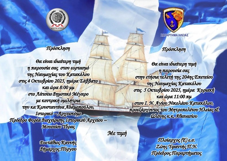 Ξεκινούν το Σάββατο 4 Οκτωβρίου και ολοκληρώνονται την Κυριακή 5 του μήνα οι διήμερες τιμητικές εκδηλώσεις του Δήμου Πύργου για ένα από τα σημαντικότερα ιστορικά γεγονότα της περιοχής κατά την επανάσταση του 1821,τη Ναυμαχία του Κατακόλου, η οποία έγινε στις 30 Σεπτεμβρίου του 1821.