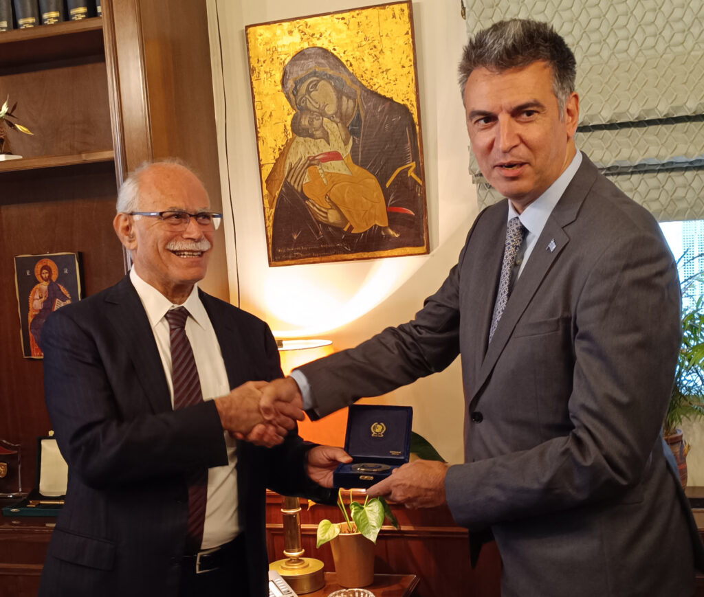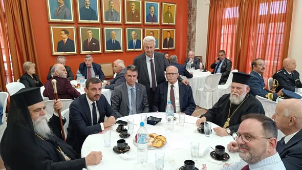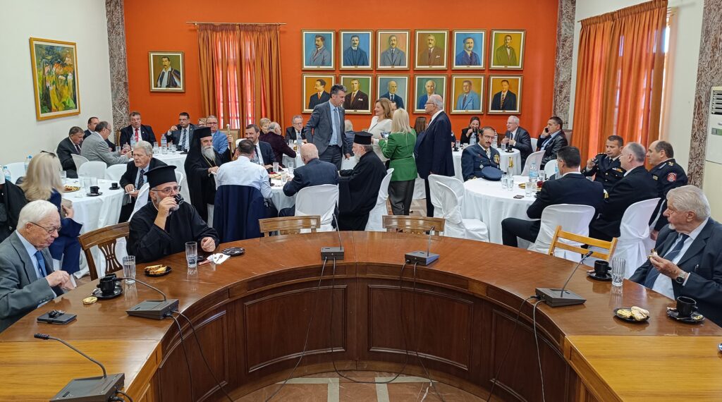 Πριν την καθιερωμένη δεξίωση στο Λάτσειο Δημοτικό Μέγαρο, ο κ. Καννής απένειμε αναμνηστική πλακέτα με το έμβλημα του Δήμου στον εκπρόσωπο της Κυβέρνησης, Γενικό Γραμματέα Διεθνών Οικονομικών Σχέσεων & Εξωστρέφειας Υπουργείου Εξωτερικών, Δημήτρη Σκάλκο.