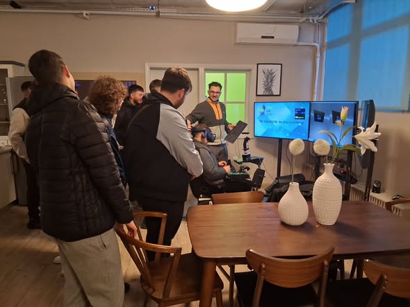 Ιδιαίτερο ενδιαφέρον προκάλεσε η παρουσίαση της εποπτείας και του ελέγχου των συστημάτων μέσω περιβάλλοντος εικονικής πραγματικότητας, όπου οι μαθητές είδαν πώς μπορεί να γίνεται η παρακολούθηση και η διαχείριση ενός έξυπνου κτιρίου μέσα από ειδική οθόνη VR, συνδυάζοντας τεχνολογία, καινοτομία και πρακτική εφαρμογή.