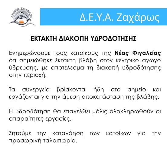 ΔΗΜΟΣ ΖΑΧΑΡΩΣ, ΕΝΗΜΕΡΩΣΗΈκτακτη διακοπή υδροδότησης στη Δημοτική Κοινότητα Νέας Φιγαλείας27 Ιανουαρίου, 2026 Προηγούμενο Άρθρο Φρικτό τροχαίο στη Ρουμανία – Νεκροί 7 οπαδοί του ΠΑΟΚ Επόμενο Άρθρο Σε εκδήλωση στην Αθήνα για τον αγωνιστή της Δημοκρατίας ο Δήμαρχος Πύργου Στάθης Καννής