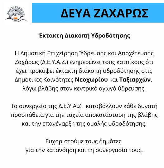 Η Δημοτική Επιχείρηση Ύδρευσης και Αποχέτευσης Ζαχάρως (Δ.Ε.Υ.Α.Ζ.) ενημερώνει τους κατοίκους ότι έχει προκύψει έκτακτη διακοπή υδροδότησης στις Δημοτικές Κοινότητες Νεοχωρίου και Ταξιαρχών, λόγω βλάβης στον κεντρικό αγωγό ύδρευσης.