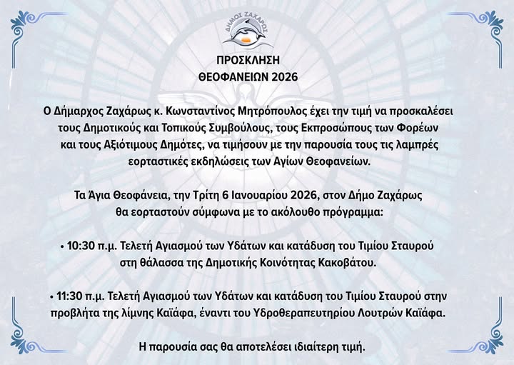 Ο Δήμαρχος Ζαχάρως κ. Κωνσταντίνος Μητρόπουλος προσκαλεί τους Δημότες και τους Εκπροσώπους των Φορέων να τιμήσουν με την παρουσία τους τις εορταστικές εκδηλώσεις των Αγίων Θεοφανείων.
