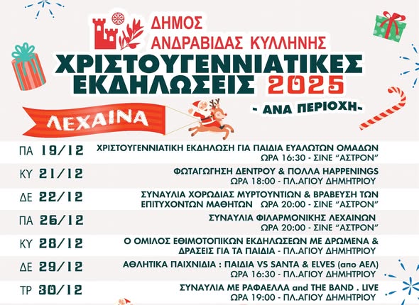 Με πνεύμα χαράς και αισιοδοξίας, ο Δήμος Ανδραβίδας Κυλλήνης ανακοινώνει το Επίσημο Πρόγραμμα Χριστουγεννιάτικων Εκδηλώσεων για την περίοδο των εορτών.