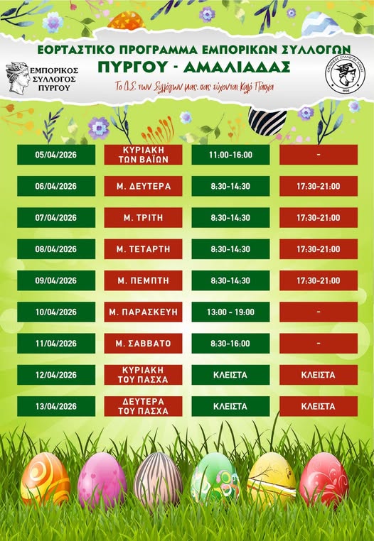 Στο πλαίσιο της κοινής πορείας και συνεργασίας των τελευταίων ετών μεταξύ των Εμπορικών Συλλόγων Πύργου και Ήλιδας, ανακοινώνεται το κοινό εορταστικό ωράριο για το Πάσχα
