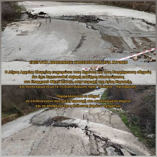 Ο Δήμος Αρχαίας Ολυμπίας ενημερώνει τους δημότες και τους διερχόμενους οδηγούς ότι έχει διαπιστωθεί σοβαρή καθίζηση οδοστρώματος στο Επαρχιακό Οδικό Δίκτυο, στην περιοχή της Αγίας Κυριακής, και συγκεκριμένα μετά τη διασταύρωση προς Τσίπιανα – Κρυόβρυση.
