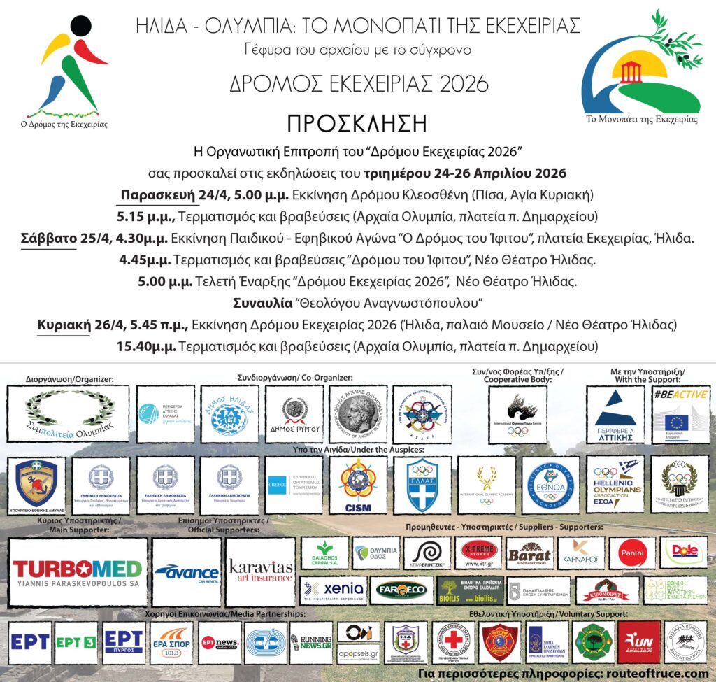 Η Οργανωτική Επιτροπή του «Δρόμου Εκεχειρίας 2026» ανακοινώνει τη διοργάνωση των καθιερωμένων εκδηλώσεων που θα πραγματοποιηθούν από την Παρασκευή 24 έως και την Κυριακή 26 Απριλίου 2026, συνδέοντας συμβολικά και ουσιαστικά την Ήλιδα με την Αρχαία Ολυμπία, μέσα από το ιστορικό μονοπάτι της Εκεχειρίας.