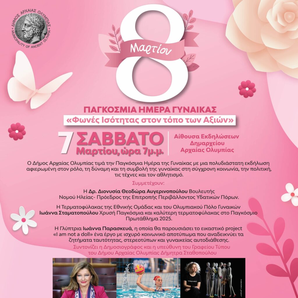 Ο Δήμος Αρχαίας Ολυμπίας σας προσκαλεί σε μια ξεχωριστή εκδήλωση αφιερωμένη στην Παγκόσμια Ημέρα της Γυναίκας, με τίτλο «Φωνές Ισότητας στον τόπο των Αξιών», η οποία θα πραγματοποιηθεί στην αίθουσα εκδηλώσεων του Δημαρχείου στην Αρχαία Ολυμπία, το Σάββατο 7 Μαρτίου, στις 7 το απόγευμα.