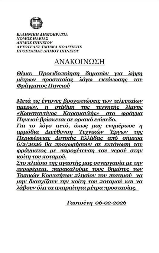 ΔΗΜΟΣ ΠΗΝΕΙΟΥ, ΠΕΡΙΒΑΛΛΟΝΦούσκωσε σημείο του Φράγματος Πηνειού λόγω των βροχοπτώσεων!6 Φεβρουαρίου, 2026 Προηγούμενο Άρθρο Φωνή του Δήμου Ανδραβίδας-Κυλλήνης στη Βουλή των Ελλήνων Επόμενο Άρθρο Φαντασμαγορική έναρξη για το 9ο «Καρναβάλι Αμαλιάδας» με τον FY (ΦΩΤΟ)