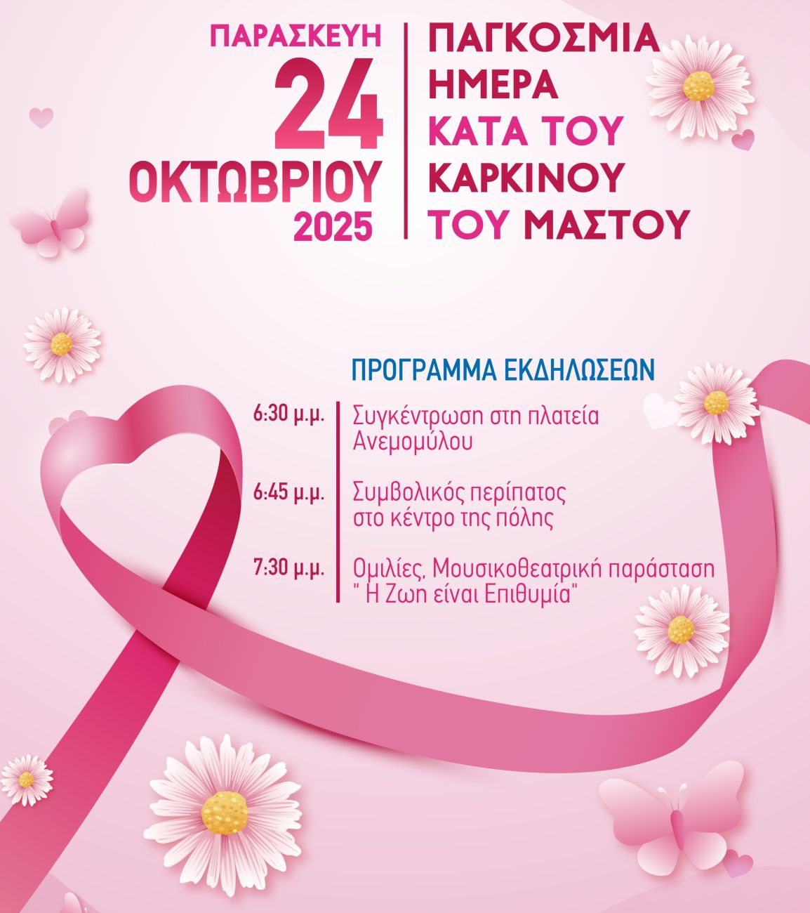 Η «ροζ» παρέλαση θα ξεκινήσει κανονικά -όπως έχει προγραμματιστεί- στις 18:30 από την πλατεία Ανεμομύλου κατευθυνόμενη στο κέντρο της πόλης, ωστόσο, το μουσικοθεατρικό έργο: «Η ζωή είναι επιθυμία» και η υπόλοιπη εκδήλωση θα πραγματοποιηθούν στον Πολυχώρο Πολιτισμού Δήμου Ήλιδας, με ώρα έναρξης στις 19:30.