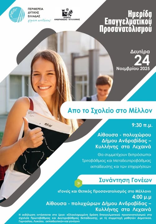 ΔΗΜΟΣ ΑΝΔΡΑΒΙΔΑΣ - ΚΥΛΛΗΝΗΣ, ΕΝΗΜΕΡΩΣΗΗμερίδα Επαγγελματικού Προσανατολισμού στα Λέχαινα τη Δευτέρα 24 Νοεμβρίου22 Νοεμβρίου, 2025 Προηγούμενο Άρθρο Επίσκεψη Μαθητών του ΓΕ.Λ. Ανδραβίδας στον Δήμαρχο για το Πρόγραμμα «Σχολεία-Πρέσβεις του Ευρωπαϊκού Κοινοβουλίου» Επόμενο Άρθρο Πύργος: Δράσεις πρόληψης και ψυχοκοινωνικής στήριξης από το «Χαμόγελο του παιδιού»