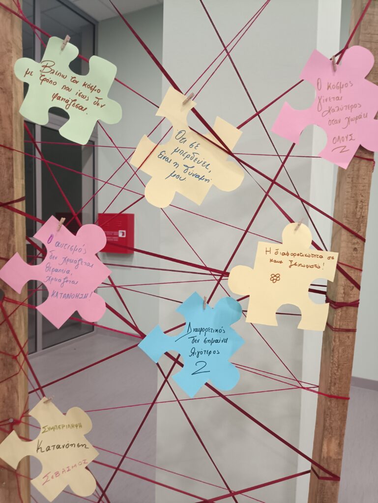 Ιδιαίτερη συμβολική αξία είχε η δράση των μαθητών του Λυκείου Ζαχάρως, οι οποίοι κατέγραψαν σκέψεις και συναισθήματα σε κομμάτια παζλ, τα οποία εκτέθηκαν στον χώρο του Πολύκεντρου, αναδεικνύοντας τη σημασία της αποδοχής και της συμπερίληψης.