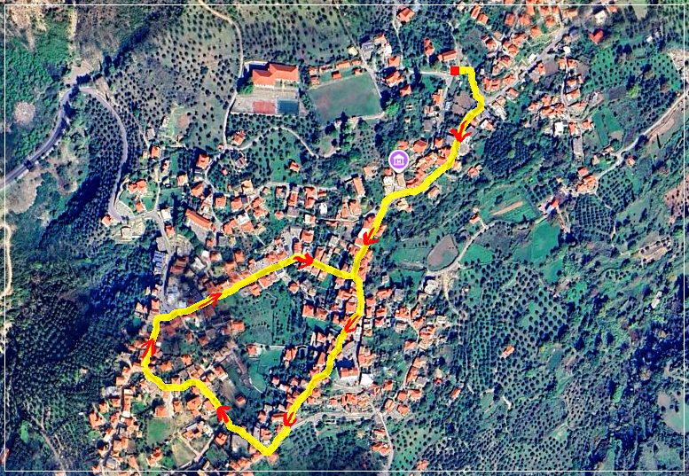 Ι.Ν Υπαπαντής Κυρίου > Γέφυρα Τρανής Βρύσης > Κεντρική Πλατεία > Γειτονιά Οικίας Καλογιάννη > Ι.Ν Αγίας Τριάδας > Ι.Ν Μεταμορφώσεως Σωτήρος > Κεντρική Οδός > Διασταύρωση Προς Πετράλωνα > Λαογραφικό Μουσείο > Γέφυρα Τρανής Βρύσης > Ι.Ν Υπαπαντής Κυρίου