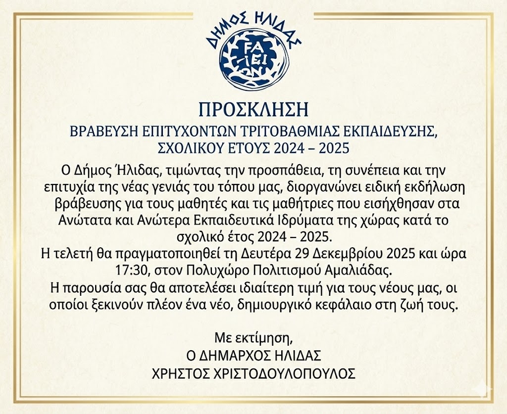 Ο Δήμος Ήλιδας, τιμώντας την προσπάθεια, τη συνέπεια και την επιτυχία της νέας γενιάς του τόπου μας, διοργανώνει ειδική εκδήλωση βράβευσης για τους μαθητές και τις μαθήτριες που εισήχθησαν στα Ανώτατα και Ανώτερα Εκπαιδευτικά Ιδρύματα της χώρας κατά το σχολικό έτος 2024 – 2025.
