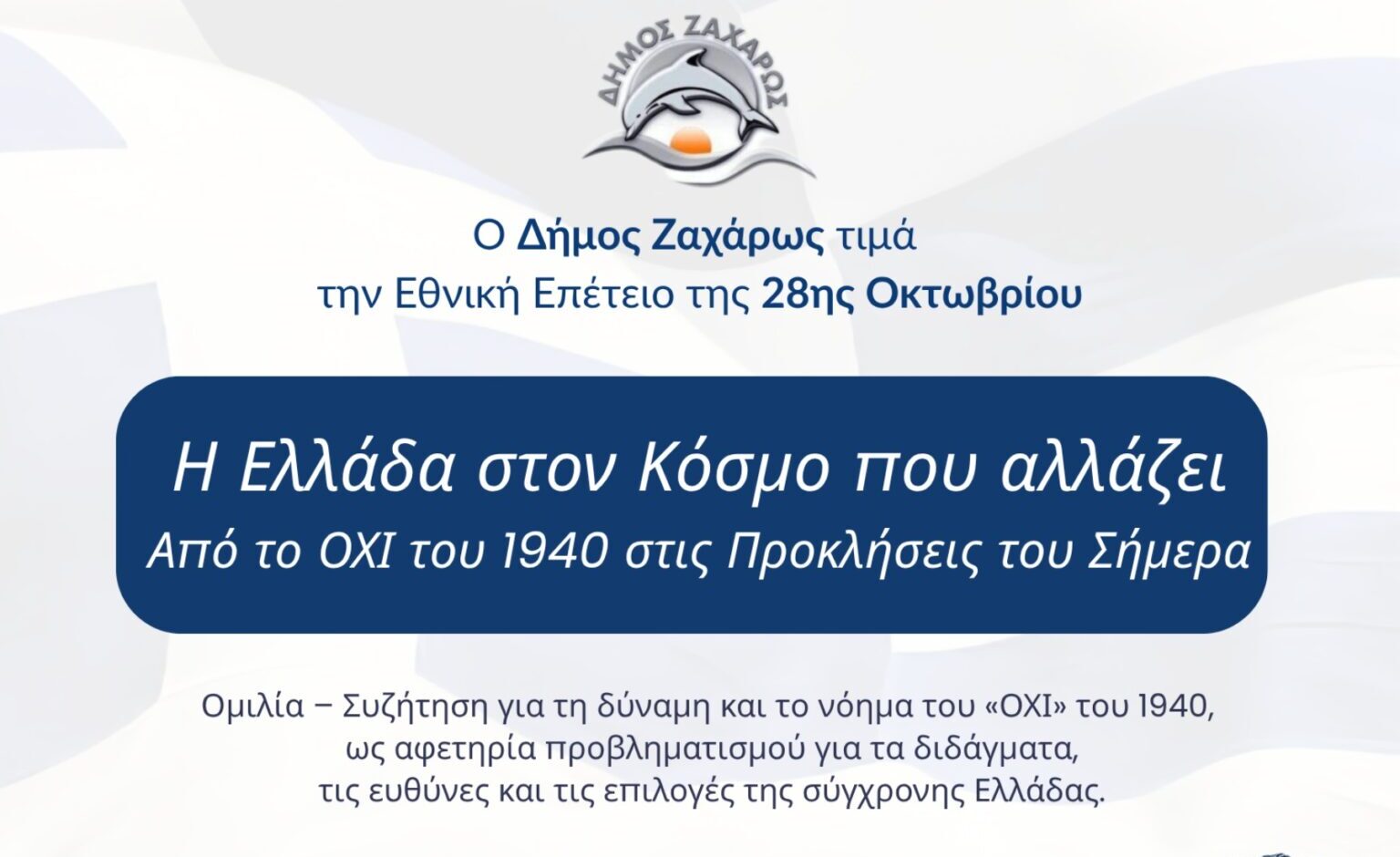 Ο Δήμος Ζαχάρως τιμά την Εθνική Επέτειο της 28ης Οκτωβρίου με την εκδήλωση «Η Ελλάδα στον Κόσμο που αλλάζει: Από το ΟΧΙ του 1940 στις Προκλήσεις του Σήμερα», η οποία θα πραγματοποιηθεί την Παρασκευή 24 Οκτωβρίου 2025 και ώρα 19:00, στο Πολύκεντρο του Δήμου Ζαχάρως.