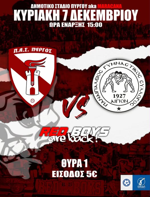 ΑΘΛΗΤΙΚΑ, ΔΗΜΟΣ ΠΥΡΓΟΥΠ.Α.Σ. ΠΥΡΓΟΣ vs Παναιγιαλειακός Γυμναστικός Σύλλογος σήμερα το μεσημέρι7 Δεκεμβρίου, 2025 Προηγούμενο Άρθρο Πηνειός: Κινηματογραφική κλοπή ΑΤΜ από σούπερ μάρκετ στη Γαστούνη – Ταυτοποιήθηκαν οι δράστες Επόμενο Άρθρο ΑΠΟΛΛΩΝ Ν. ΦΙΓΑΛΕΙΑΣ vs ΠΑΟ ΒΑΡΔΑΣ
