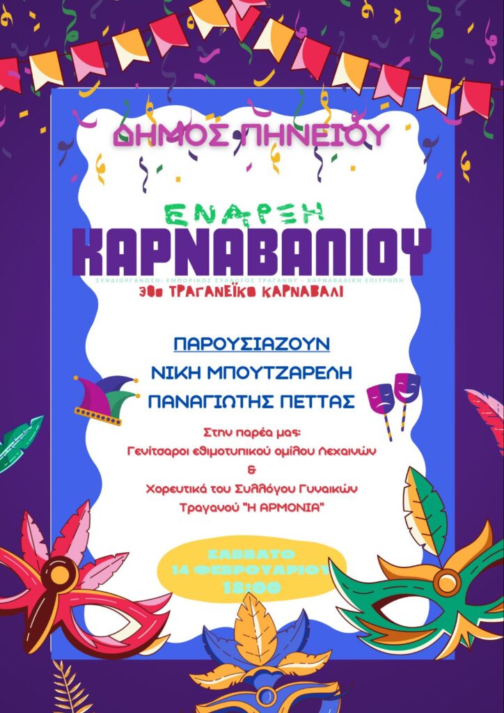 Με ανανεωμένη διάθεση και ακόμη πιο δυναμικό πρόγραμμα, ο Δήμος Πηνειού προσκαλεί μικρούς και μεγάλους να βιώσουν την εμπειρία των φετινών Αποκριών. Το Τραγανό και το Βαρθολομιό γίνονται για ακόμη μία χρονιά οι βασικοί πυρήνες της γιορτής, μετατρέποντας πλατείες και δρόμους σε ένα μεγάλο σκηνικό χαράς, δημιουργίας και φαντασίας.