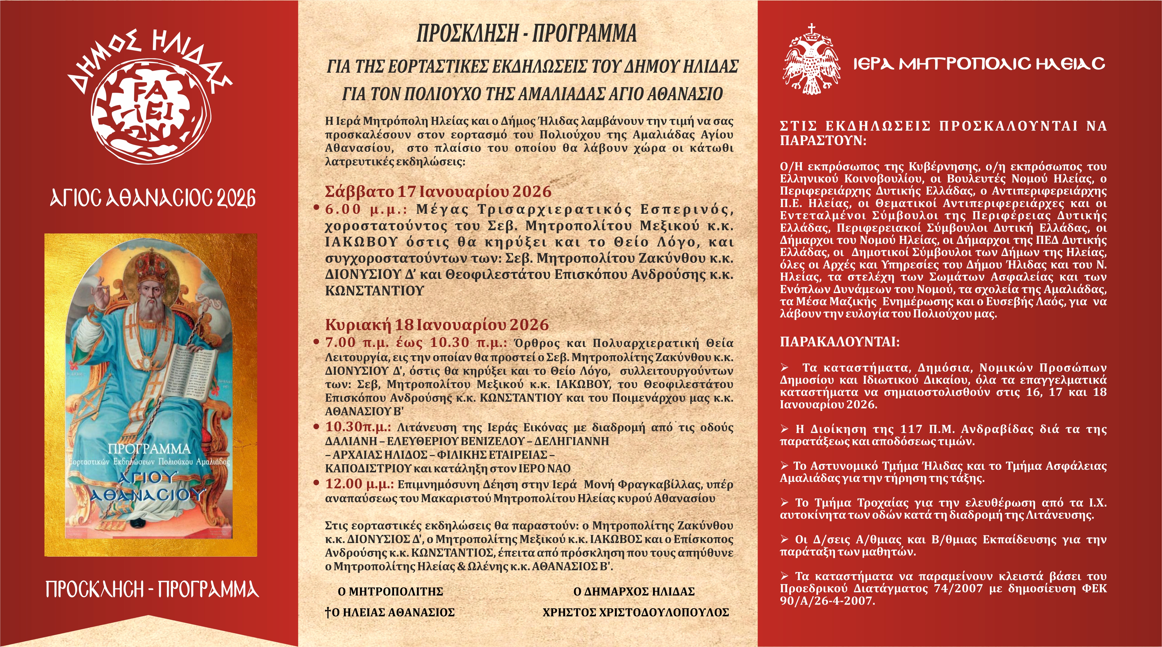 Με εκκλησιαστική μεγαλοπρέπεια και τη θρησκευτική κατάνυξη που επιβάλλει η παράδοση, ο Δήμος Ήλιδας και η Ιερά Μητρόπολη Ηλείας προετοιμάζονται για τον φετινό εορτασμό του Πολιούχου της Αμαλιάδας, Αγίου Αθανασίου.
