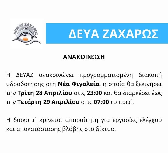 ΔΗΜΟΣ ΖΑΧΑΡΩΣ, ΕΝΗΜΕΡΩΣΗΠρογραμματισμένη διακοπή υδροδότησης στη Νέα Φιγαλεία28 Απριλίου, 2026 σήμερα Προηγούμενο Άρθρο Τρία στα τρία στο 5ο Ηλυσιακός wimming Family Cup Masters Επόμενο Άρθρο Συνεχίζονται οι προληπτικές εξετάσεις σε κοινότητες του δήμου Ζαχάρως από τις Κινητές Ομάδες Υγείας