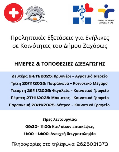 Ο Δήμος Ζαχάρως, σε συνεργασία με τις Κινητές Ομάδες Υγείας (ΚΟμΥ) του ΕΟΔΥ και το Υπουργείο Υγείας, υλοποιεί ένα σημαντικό πρόγραμμα προληπτικής ιατρικής, με στόχο την ενίσχυση της υγείας και της ευεξίας των ενήλικων κατοίκων των χωριών του Δήμου. Οι δράσεις απευθύνονται σε όλους τους ενήλικες πολίτες, ανεξαρτήτως φύλου και ηλικίας.