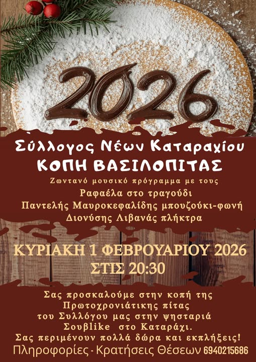 Ο Σύλλογος Νέων Καταραχίου ανοίγει τη χρονιά δυναμικά και σας καλεί σε μια βραδιά γεμάτη μουσική, κέφι και πολλές εκπλήξεις. Ελάτε να κόψουμε τη βασιλόπιτα, να ανταμώσουμε και να ξεκινήσουμε το 2026 όλοι μαζί, όπως μας αξίζει: με χαμόγελα και καλή παρέα.