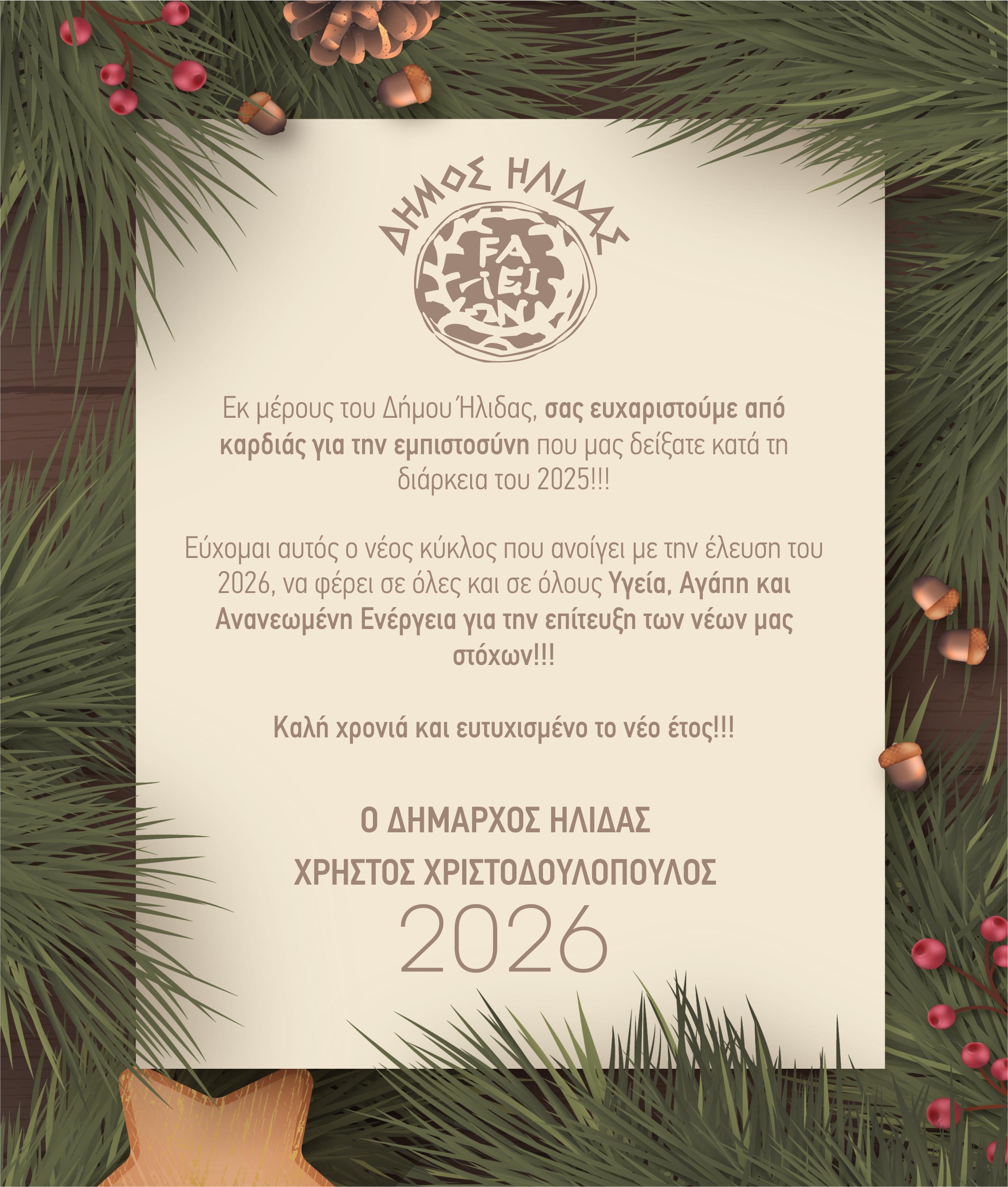 Κάθε Πρωτοχρονιά φέρνει μαζί της την ελπίδα για μια νέα αρχή. Για εμάς, στον Δήμο Ήλιδας, είναι η χρονιά που οφείλουμε να ενισχύσουμε περαιτέρω τους δεσμούς που μας κρατούν ενωμένους. Συνεχίζουμε όλοι μαζί, με αμείωτη ένταση, την προσπάθεια για έναν Δήμο σύγχρονο, λειτουργικό και πρωταγωνιστή στις εξελίξεις.