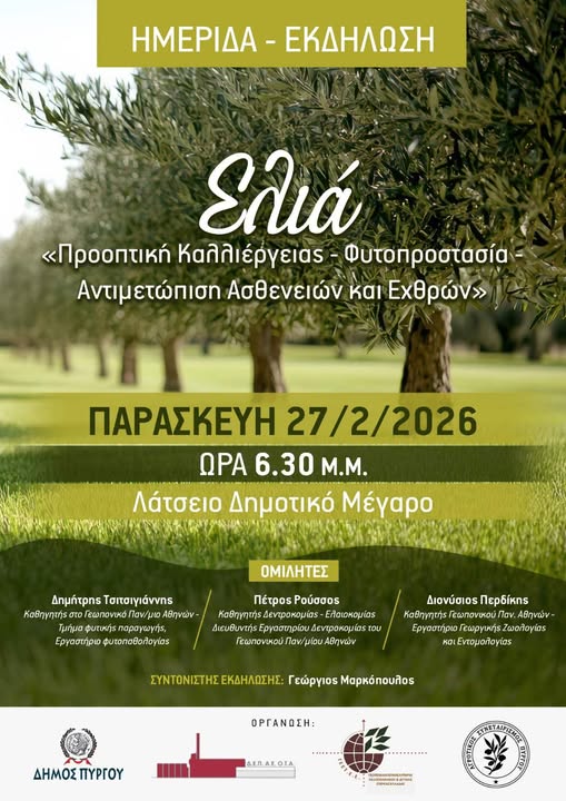 Ο Δήμος Πύργου και η ΔΕΠ ΑΕ ΟΤΑ Πύργου, σε συνεργασία με το παράρτημα Πελοποννήσου και Δυτικής Στερεάς Ελλάδος του ΓΕΩΤΕΕ και τον Αγροτικό Συνεταιρισμό Πύργου, διοργανώνουν εκδήλωση – συζήτηση για την ελιά, τις ασθένειες και τους εχθρούς που προσβάλλουν την καλλιέργεια, καθώς επίσης και τους σύγχρονους τρόπους αντιμετώπισής τους.
