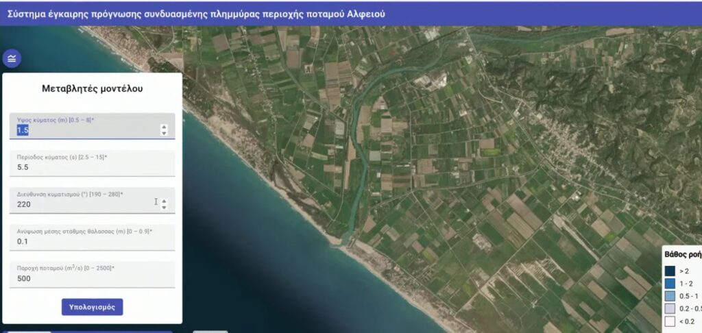 Ο Δρ. Ανδρέας Παπαδημητρίου, Ερευνητικός Συνεργάτης του ΕΛΕ, πραγματοποίησε ζωντανή επίδειξη της διαδικτυακής πλατφόρμας πρόγνωσης πλημμύρας στην περιοχή του Αλφειού, παρουσιάζοντας στην πράξη πώς το σύστημα υπολογίζει την έκταση και τα βάθη ροής με μεγάλη ταχύτητα και ακρίβεια, αξιοποιώντας τις ίδιες κρίσιμες εισροές που περιγράφονται στο κεντρικό μοντέλο του έργου.
