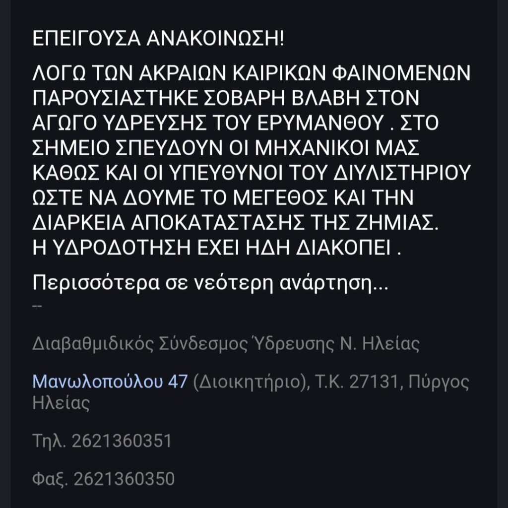 Ενημερώνουμε τους κατοίκους των χωριών που υδροδοτούνται από τον Ερύμανθο ότι, από τη μεγάλη ζημιά που έχει προκαλέσει η κακοκαιρία, στο γεφύρι του Κλαδέου, από τα Μαμουσέικα προς Κοσκινά, θα παραμείνουν χωρίς νερό μέχρι την αποκατάσταση της ζημιάς στον κεντρικό αγωγό Ερυμάνθου.