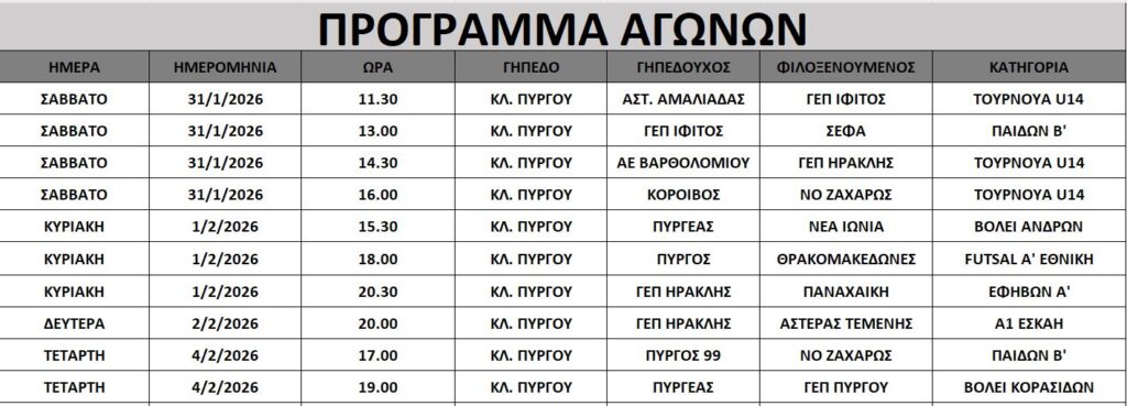 ΑΘΛΗΤΙΚΑ, ΔΗΜΟΣ ΠΥΡΓΟΥΤο πρόγραμμα των αγώνων της επόμενης εβδομάδας στο Δημοτικό Στάδιο Πύργου29 Ιανουαρίου, 2026 Προηγούμενο Άρθρο Ίφιτος Πύργου - Ήλιδα 60-66 Επόμενο Άρθρο Ιστορική νίκη για τον Ολυμπιακό στο Άμστερνταμ και πρόκριση στο Champions League