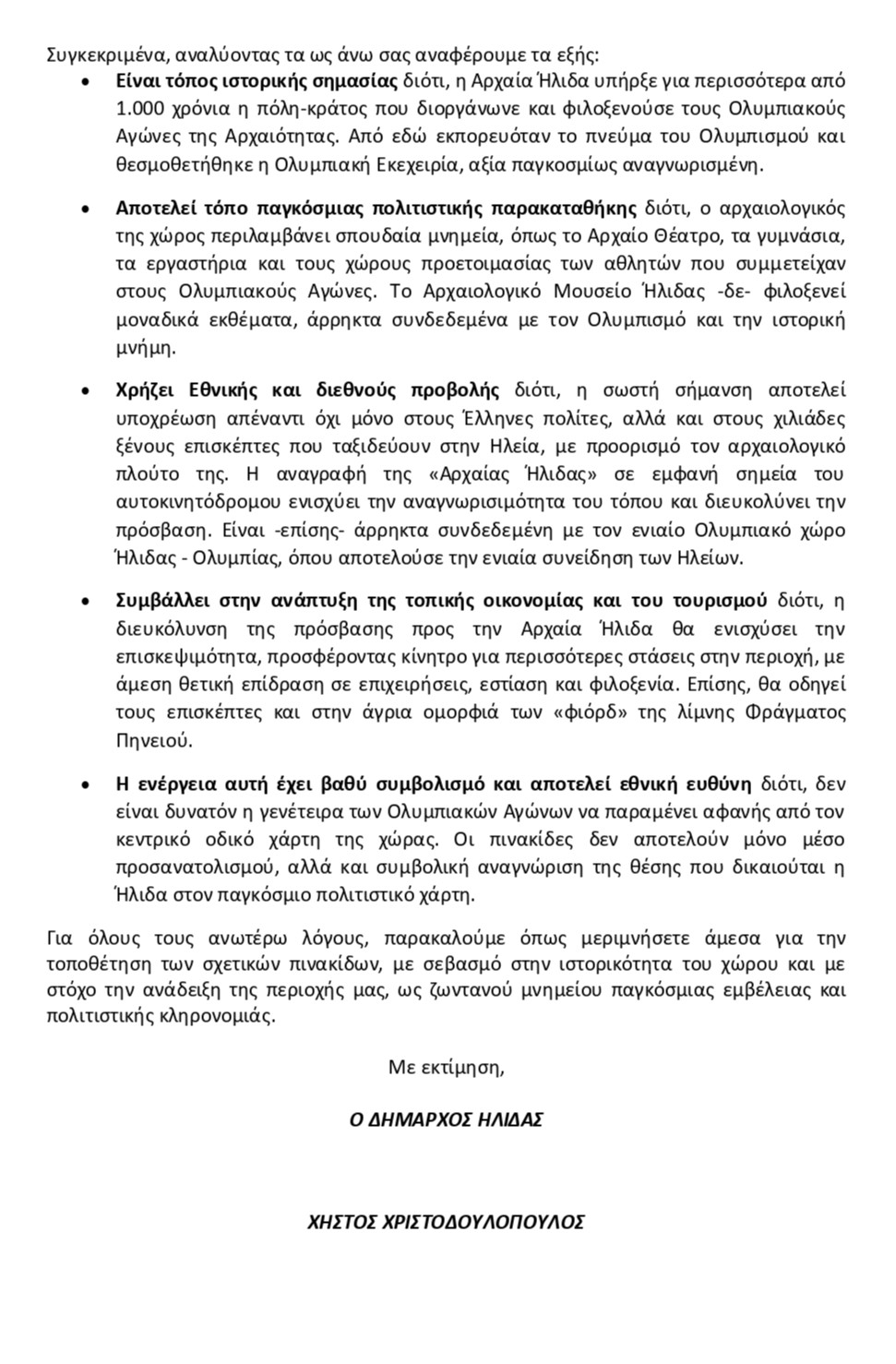 Για την επίτευξη αυτού, ο Δήμος Ήλιδας είχε αποστείλει επίσημο έγγραφο προς τον Υπουργό Υποδομών & Μεταφορών κ. Χρίστο Δήμα, και τον πρόεδρο της «Ολυμπίας Οδού», ήδη από την 1η Σεπτεμβρίου 2025, όπου τονιζόταν η ανάγκη ανάδειξης της Αρχαίας Ήλιδας ως σημείου εθνικής και διεθνούς προβολής.