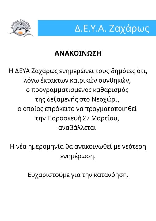 ΔΗΜΟΣ ΖΑΧΑΡΩΣ, ΕΝΗΜΕΡΩΣΗΖαχάρω: Αναβάλλεται ο καθαρισμός της δεξαμενής στο Νεοχώρι λόγω καιρού27 Μαρτίου, 2026 λόγω καιρού Προηγούμενο Άρθρο Ανδρίτσαινα - Κρέστενα: Με λαμπρότητα πραγματοποιήθηκε η κατάθεση στεφάνων και η παρέλαση (ΦΩΤΟ)