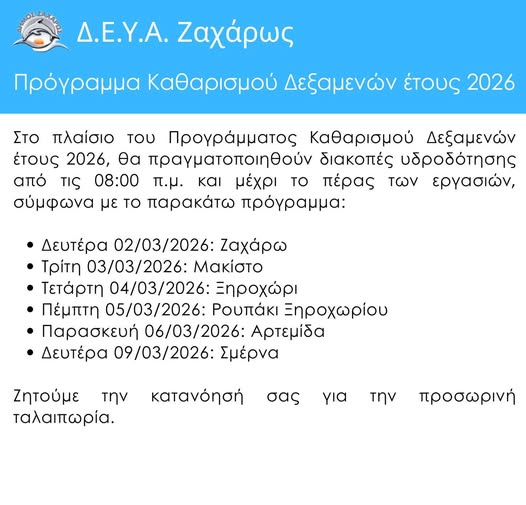Η Δ.Ε.Υ.Α. Ζαχάρως ενημερώνει ότι θα πραγματοποιηθούν διακοπές υδροδότησης από τις 08:00 π.μ. έως το πέρας των εργασιών, σύμφωνα με το παρακάτω πρόγραμμα: