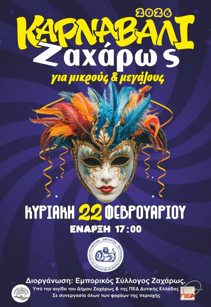 Ο Εμπορικός Σύλλογος Ζαχάρως, σε συνεργασία με τους Πολιτιστικούς Συλλόγους, τους Συλλόγους Γονέων και Κηδεμόνων των Σχολικών Μονάδων, τους Τοπικούς Φορείς και τους Εθελοντές, υπό την αιγίδα και με την υποστήριξη του Δήμου Ζαχάρως και της Π.Ε.Δ.Δ.Ε., προσκαλούν μικρούς και μεγάλους να συμμετάσχουν στις Αποκριάτικες Εκδηλώσεις 2026 που κορυφώνονται τις επόμενες ημέρες σε Ζαχάρω και Νέα Φιγαλεία.