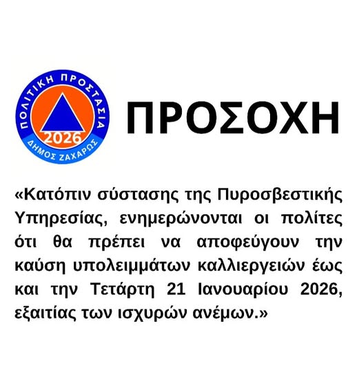 Κατόπιν σύστασης της Πυροσβεστικής Υπηρεσίας, οι πολίτες καλούνται να αποφεύγουν την καύση υπολειμμάτων καλλιεργειών έως και την Τετάρτη 21 Ιανουαρίου 2026, λόγω των ισχυρών ανέμων που επικρατούν στην περιοχή.