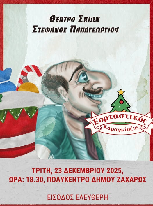 ΔΗΜΟΣ ΖΑΧΑΡΩΣ, ΠΟΛΙΤΙΣΜΟΣΖαχάρω: Θέατρο Σκιών Καραγκιόζης αύριο στο Πολύκεντρο22 Δεκεμβρίου, 2025 ΕΟΡΤΑΣΤΙΚΗ ΠΑΡΑΣΤΑΣΗ Θέατρο Σκιών Καραγκιόζης Τρίτη 23.12.2025 Ώρα: 18:30 Πολύκεντρο Δήμου Ζαχάρως Σας περιμένουμε μικρούς και μεγάλους σε μια όμορφη εορταστική παράσταση γεμάτη γέλιο, παράδοση και διασκέδαση με τον αγαπημένο μας Καραγκιόζη! Προηγούμενο Άρθρο Παρουσιάστηκε το σχέδιο δράσης του Δήμου Ήλιδας, με ορίζοντα το 2026 Επόμενο Άρθρο Τα φετινά Χριστούγεννα γίνονται… μπασκετικά για τον Δήμο Ήλιδας