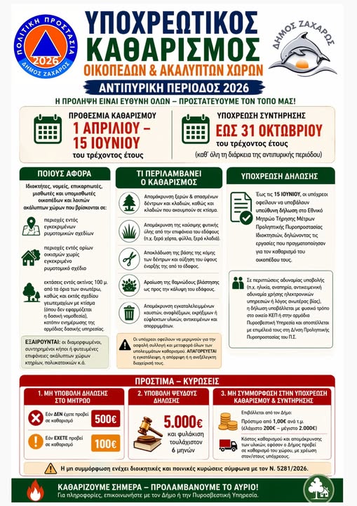 Ενημερώνουμε τους πολίτες ότι, σύμφωνα με τον Ν. 5281/2026, ο υποχρεωτικός καθαρισμός οικοπεδικών και λοιπών ακάλυπτων χώρων ξεκινά την 1η Απριλίου και ολοκληρώνεται την 15η Ιουνίου του τρέχοντος έτους, ενώ η υποχρέωση συντήρησής τους ισχύει έως την 31η Οκτωβρίου, καθ’ όλη τη διάρκεια της αντιπυρικής περιόδου.