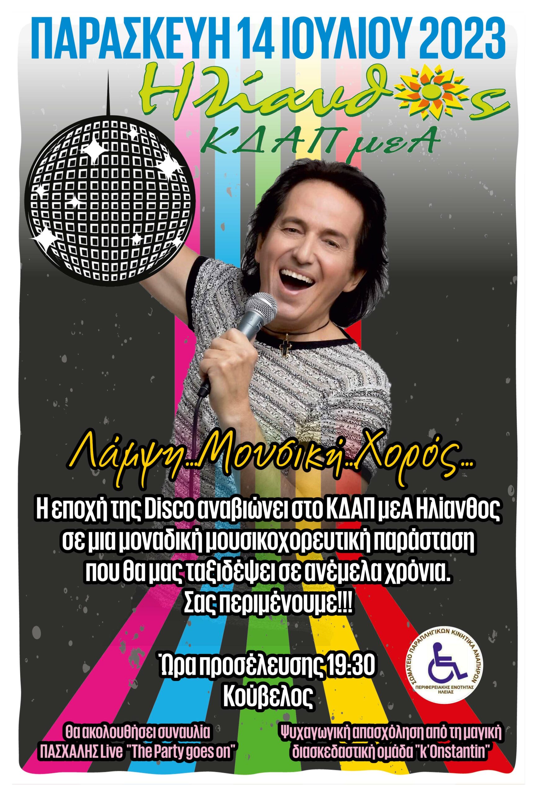 Η Ομάδα του ΚΔΑΠ μεΑ ΗΛΙΑΝΘΟΣ σας περιμένει!!!ΠΑΡΑΣΚΕΥΗ 14 ΙΟΥΛΙΟΥΏρα προσέλευσης 19:30ΚΔΑΠ μεΑ Ηλίανθος ,ΚούβελοςΘα ακολουθήσει συναυλίαΠΑΣΧΑΛΗΣ Live “The Party goes on”Ψυχαγωγική απασχόλησηαπό τη μαγική διασκεδαστικήομάδα “k’Onstantin”